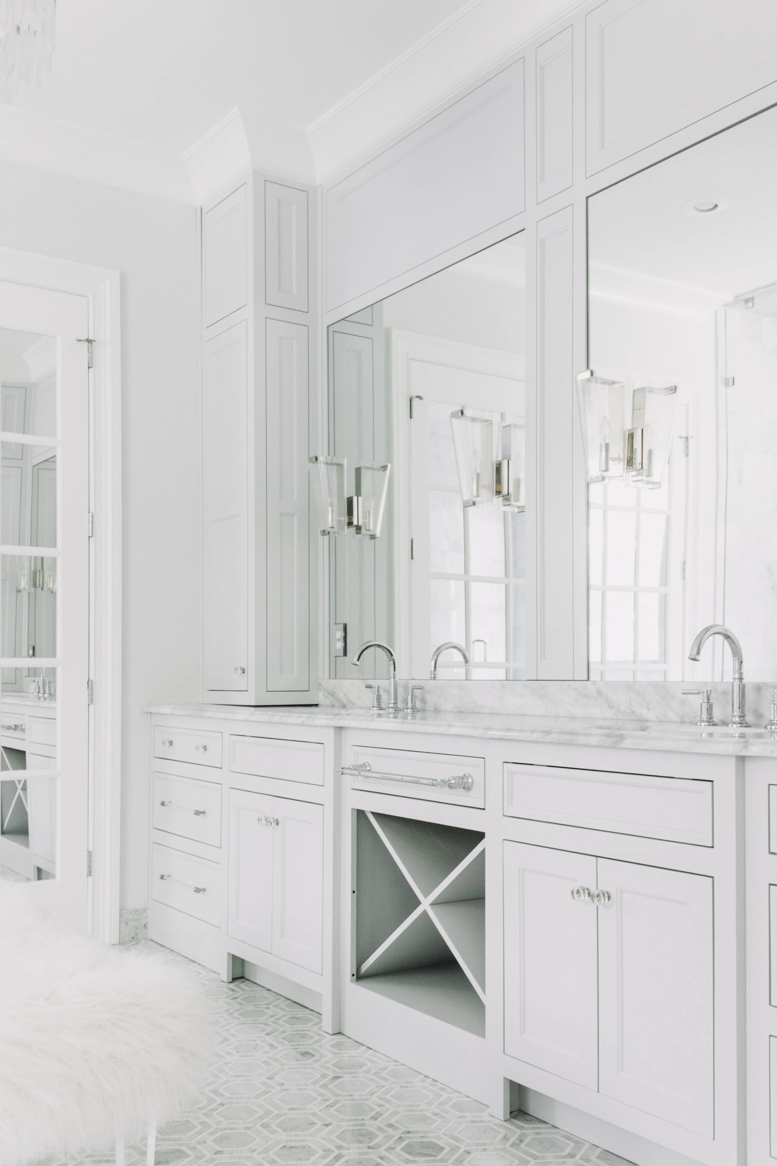 This bathtub area was inspired by the Japanese idea of shinrin yoku, or forest bathing. The soaking tub was positioned beneath a large window letting in forest views. Hexagonal marble tiles create a snappy geometric pattern on the floor. A small room used to hold this primary bathroom's toilet. Reconfiguring the space—and taking out that small space—allowed designer Alexandra Lauren to add a large window and wet room, and let in pretty views and lots of natural light.